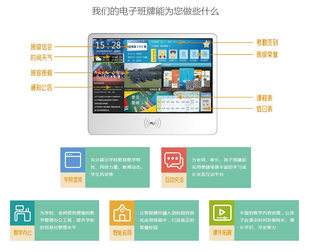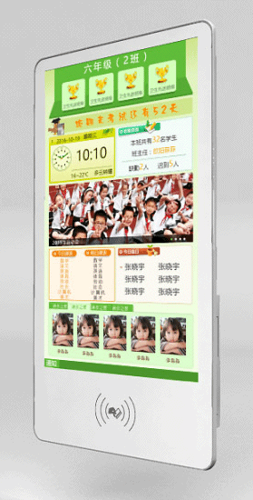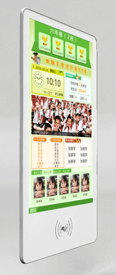 电子班牌可显示班级或教室信息、当前日期和时间、以及由传感器采集的实时数据,同时显示当前课堂所处的状态。可通过信息发布平台,连接智慧教育云平台,实时显示学校通知、班级通知,可设置集中分布式管理,自由控制每个终端;主页显示班级全面的基本信息,包括天气、班名、课程表、值日表等。还可以进行刷卡考勤数据传送至云平台端.