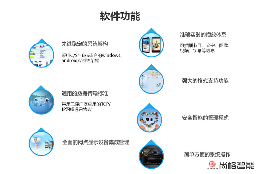 在多种大屏幕液晶和触摸屏上灵活组合视频、音频、动画,图片信息和字幕,向客户有效传递企业的营销、宣传信息,发布公告,促进互动。